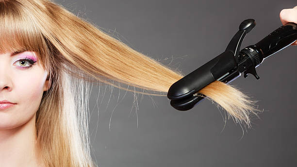 Hairstyling. Attractive blonde woman long haired making hairstyle hairdo with electric hair iron straightener gray background